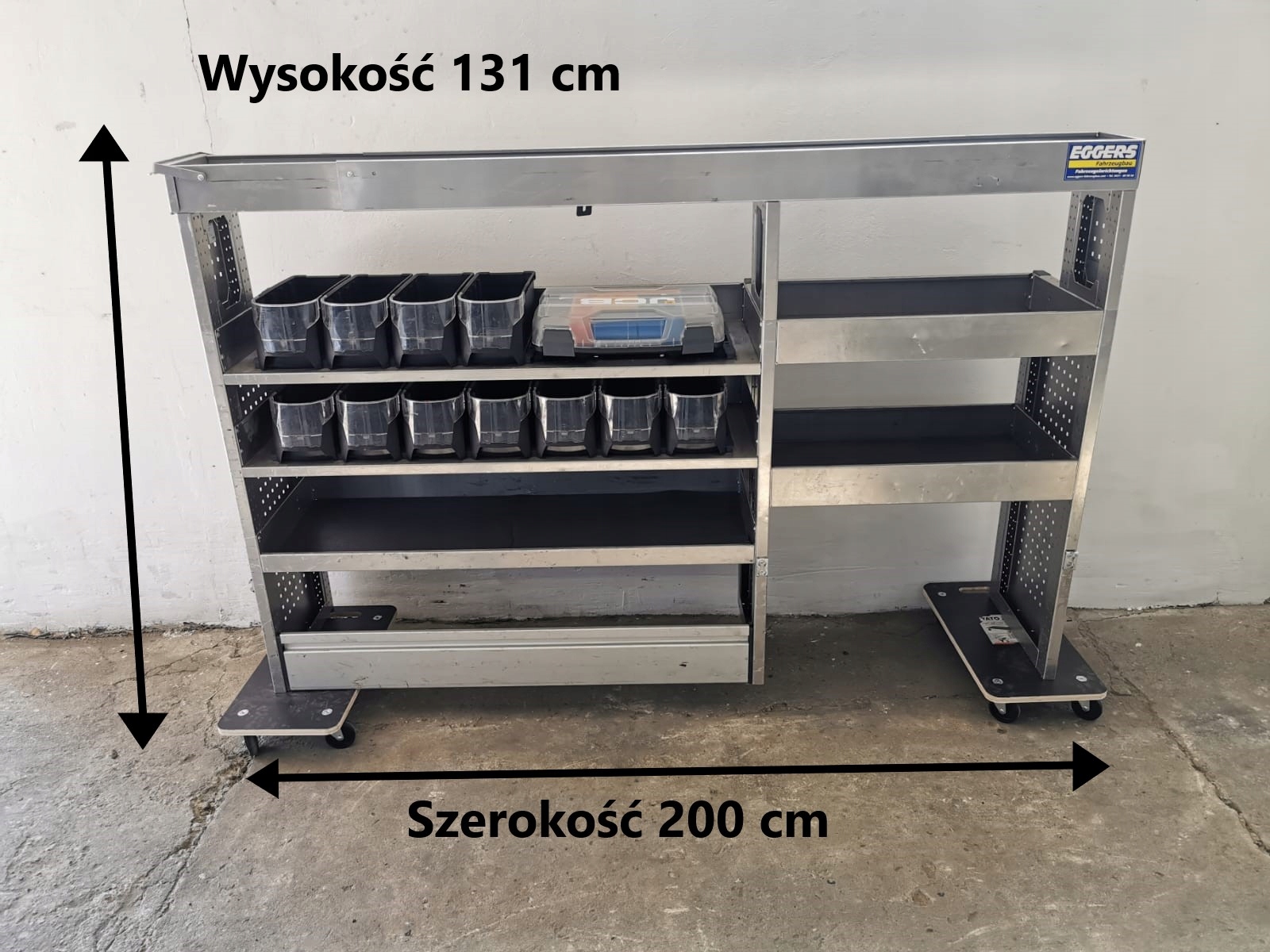 Regał samochodowy serwisowy zabudowa serwisowa warsztatowa KUWETY WALIZKA PÓŁKI ALUCA