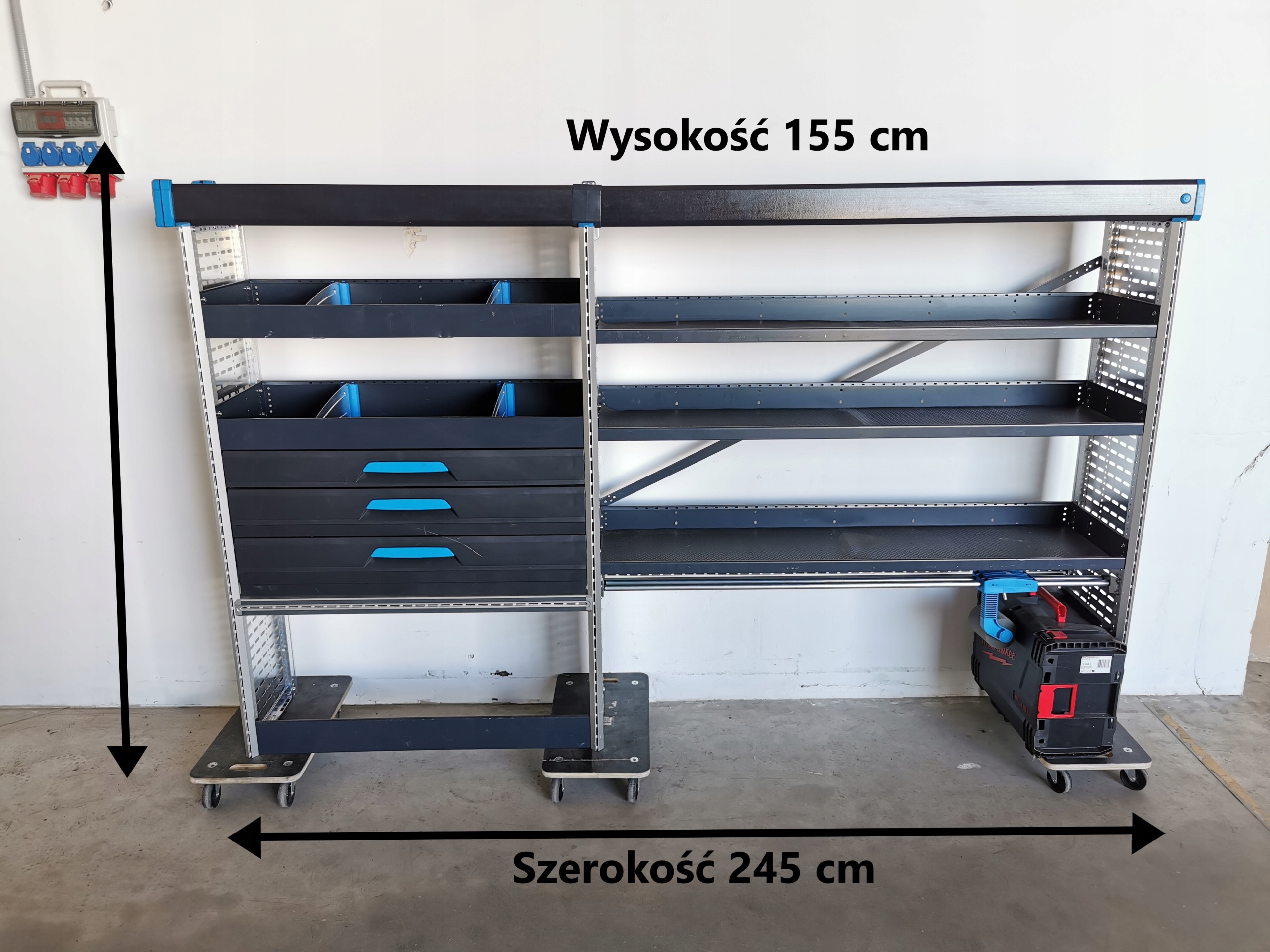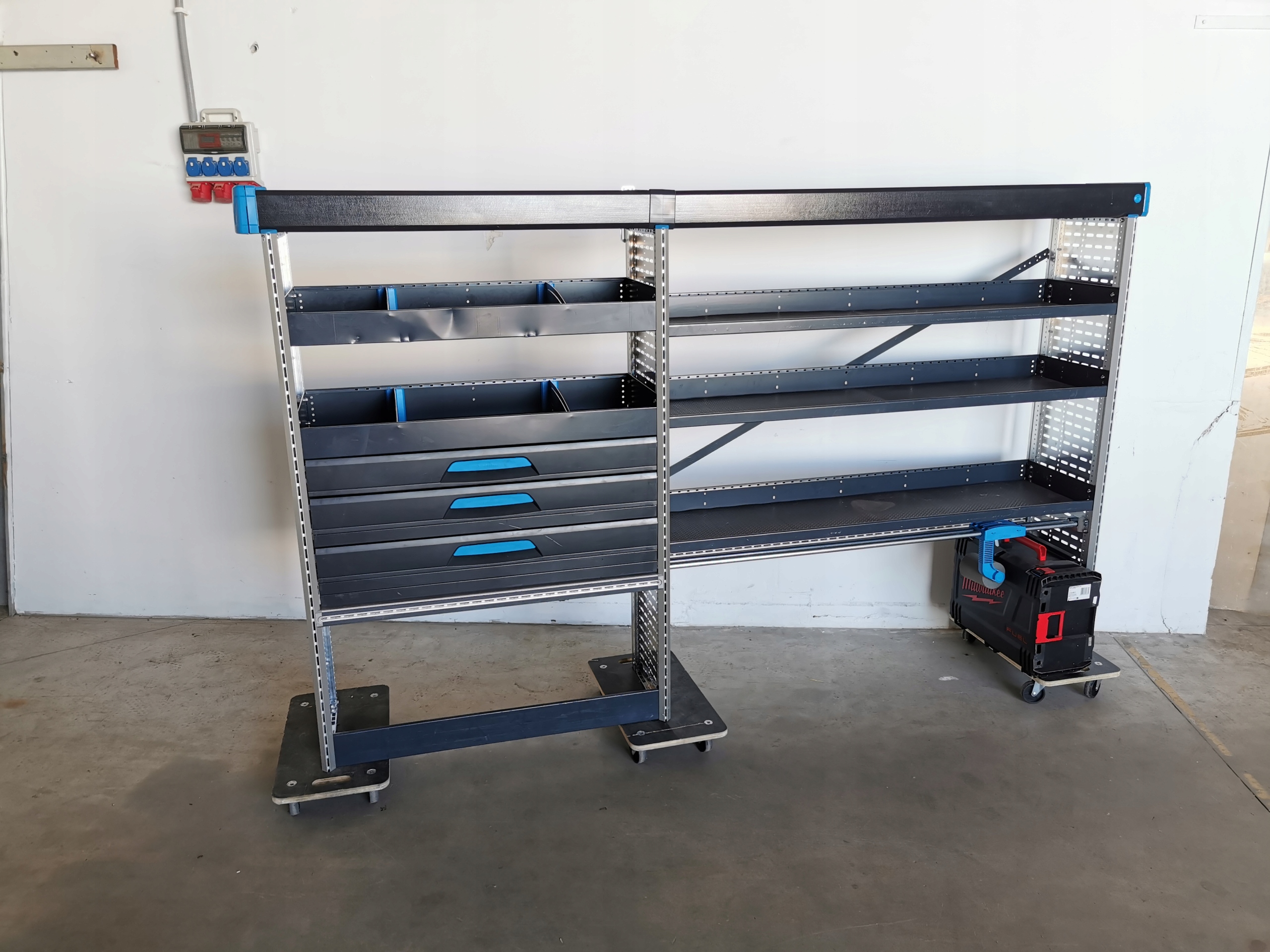 Zabudowa serwisowa warsztatowa regał samochodowy serwisowy SORTIMOSZUFLADY DOCISK NA WALIZKI PÓŁKI